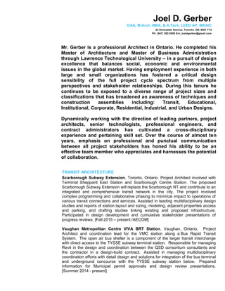 Joel Gerber is an architect with over 10 years of experience in Canada. He has a Master of Architecture and MBA from Lawrence Technological University. Gerber has worked on various transit, military, industrial, education, and residential projects for AECOM and other firms. He specializes in transit planning and has expertise in codes, standards, and guidelines for the industry.