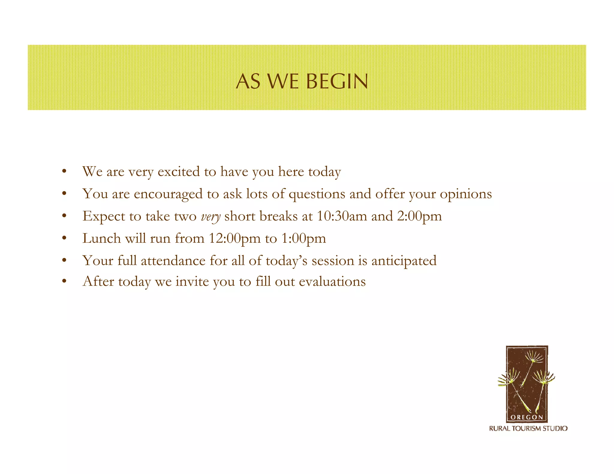 The document provides an agenda and overview for a workshop on creating and producing high impact events. The workshop will cover event definitions, audiences and lifecycles, administration, design, operations, risk, marketing, hot topics, lessons learned, and allow time for discussion. It will include presentations, breakout sessions on supporting existing and creating new events, and aim to raise awareness of tourism, engage community leaders, and connect them with resources to develop new tourism products and experiences.
