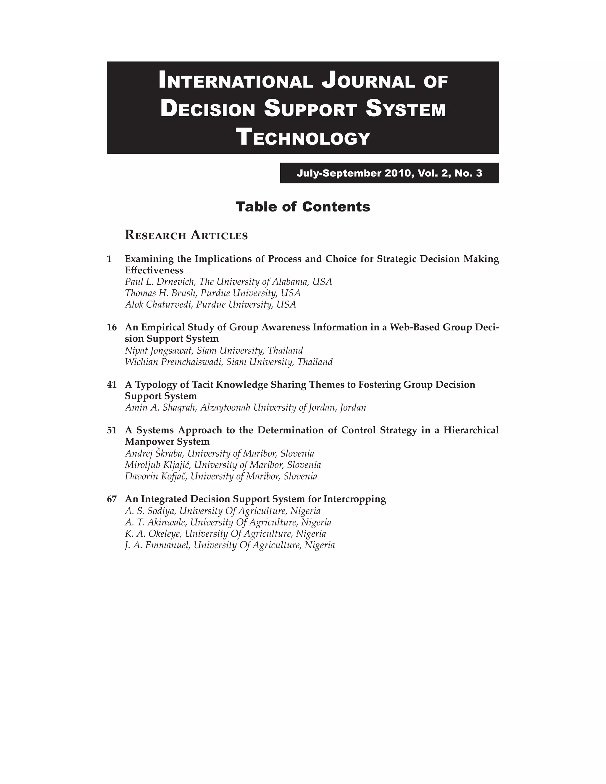 This document is the table of contents for an academic journal on decision support system technology. It lists the titles and authors of several research articles on topics related to decision making processes, agent technologies, knowledge management and other decision support systems. The articles examine issues like the implications of decision making processes and response choices on effectiveness, group awareness in web-based decision support systems, and integrated decision support systems for crop planning.