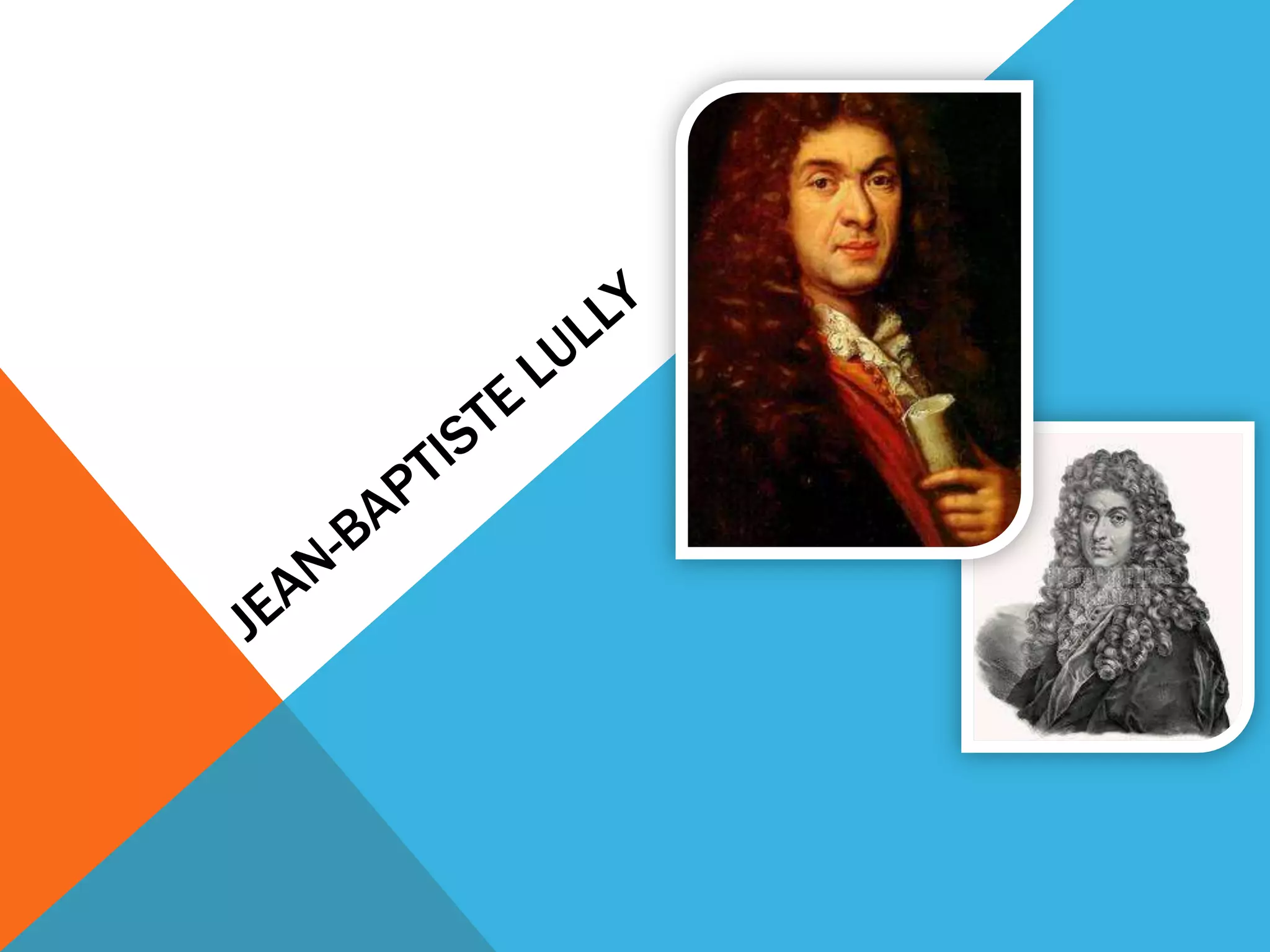 Jean-Baptiste Lully was born in Florence, Italy in 1632 and showed an early talent for music, learning guitar and violin from Franciscan friars. He moved to Paris in 1646 and gained the patronage of Louis XIV, becoming his composer and director of instrumental music. Lully established opera as a new French art form, combining drama, music, and ballet. He gained a monopoly over French opera and established strict rules for productions and the orchestra. Lully's innovations helped establish the modern orchestra and set the standard practices for conducting.