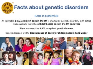 Genetic disorders are very common, affecting 1 in 25 children born in the UK. There are over 4,500 recognized genetic disorders and they are the leading cause of death for children under 14. Jeans for Genes raises over £2 million every year by asking people to donate £1-2 to wear jeans to work or school. All the money raised is distributed among charities that support people affected by genetic conditions and fund research into these conditions.