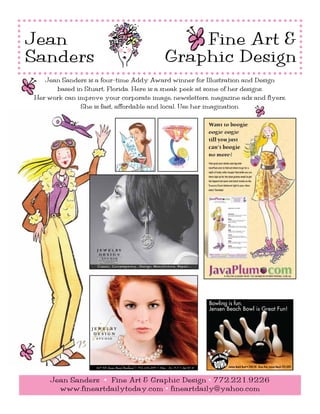 Jean Sanders is a graphic designer based in Stuart, Florida who has won multiple design awards. She creates designs that can improve corporate images, newsletters, magazine ads, and flyers. Her work is fast, affordable, and local. She uses her imagination to benefit clients.