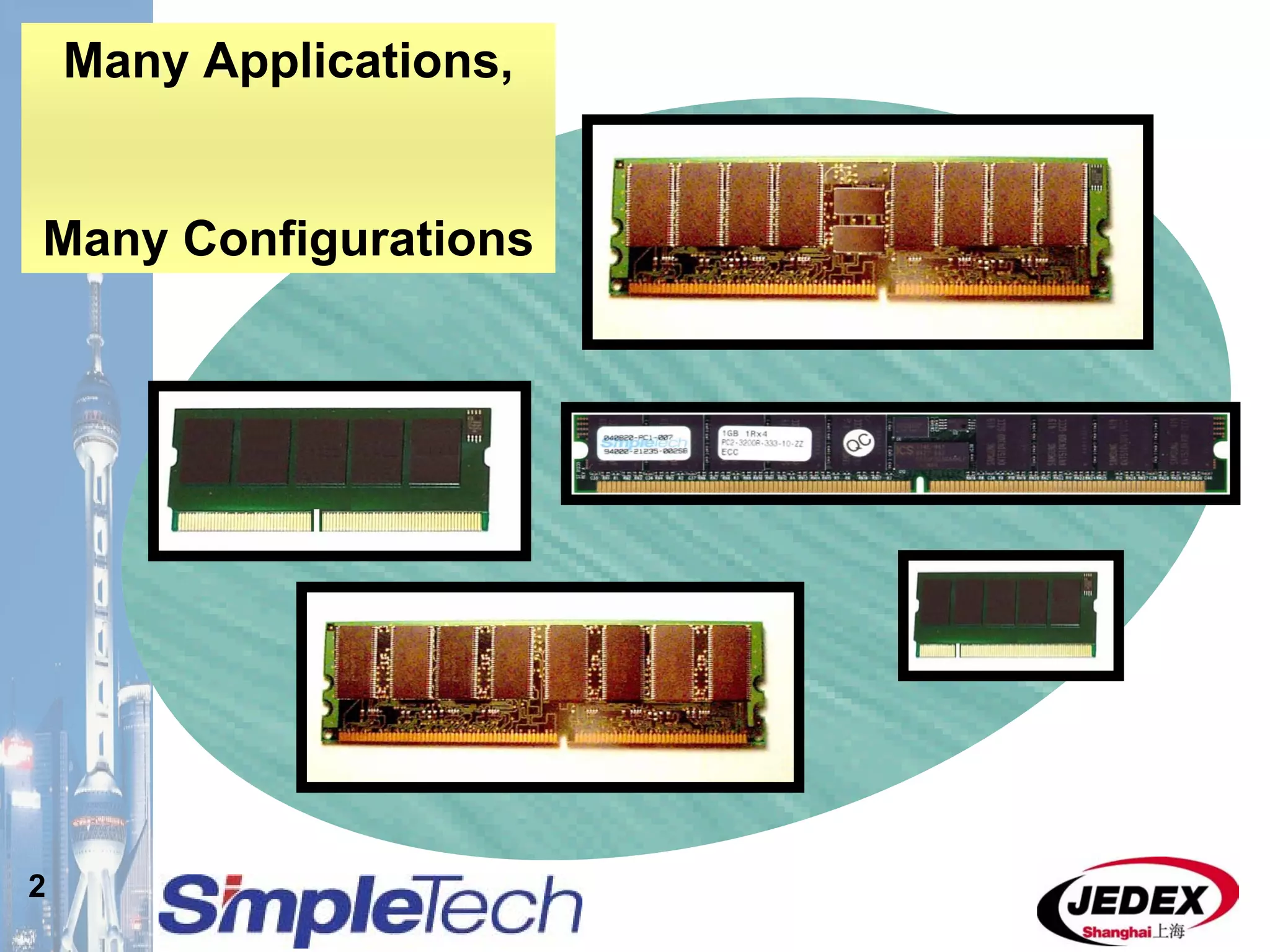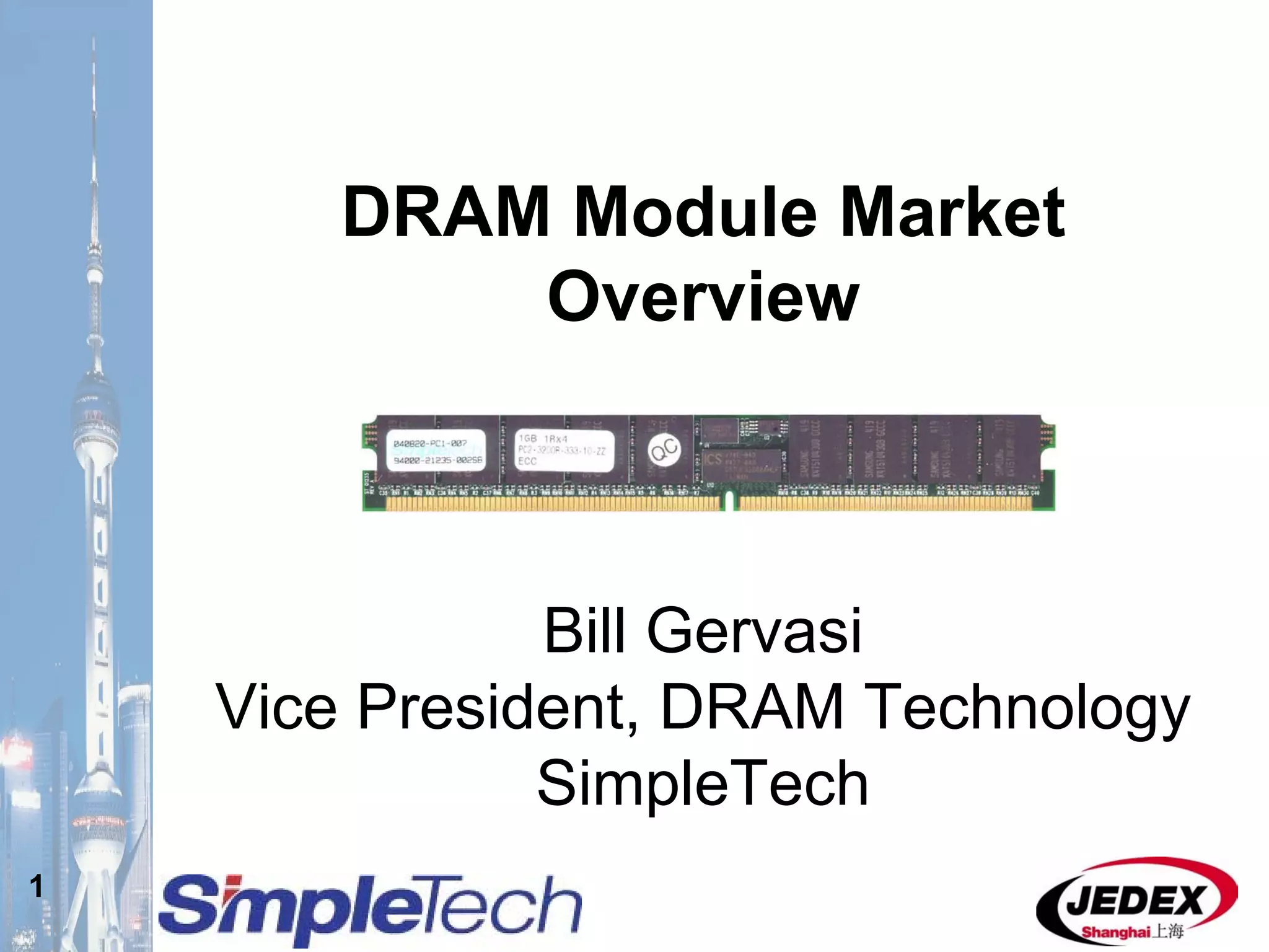 This document provides an overview of the DRAM module market and discusses various module configurations for different applications. It describes the transition from DDR1 to DDR2 and upcoming shift to DDR3. Key markets discussed include personal computers, servers, networking equipment, and peripherals. For servers, it notes ongoing debate around using fully buffered DIMMs (FB-DIMMs) versus registered DIMMs (RDIMMs). New module formats like mini-RDIMMs and 72b SO-RDIMMs are presented as solutions for networking routers and other embedded applications.