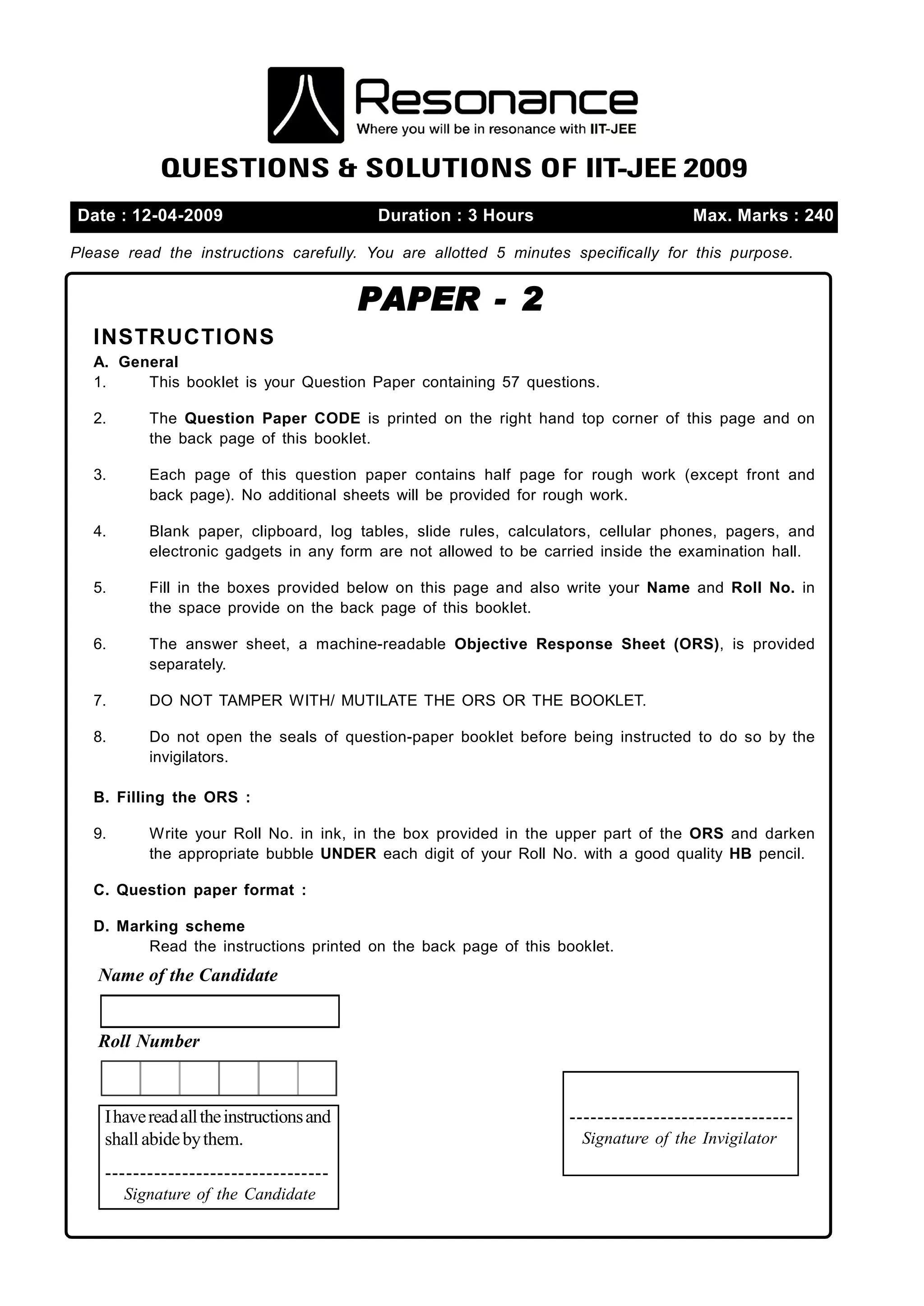 2. Students must fill out identifying information on the question paper and answer sheet.