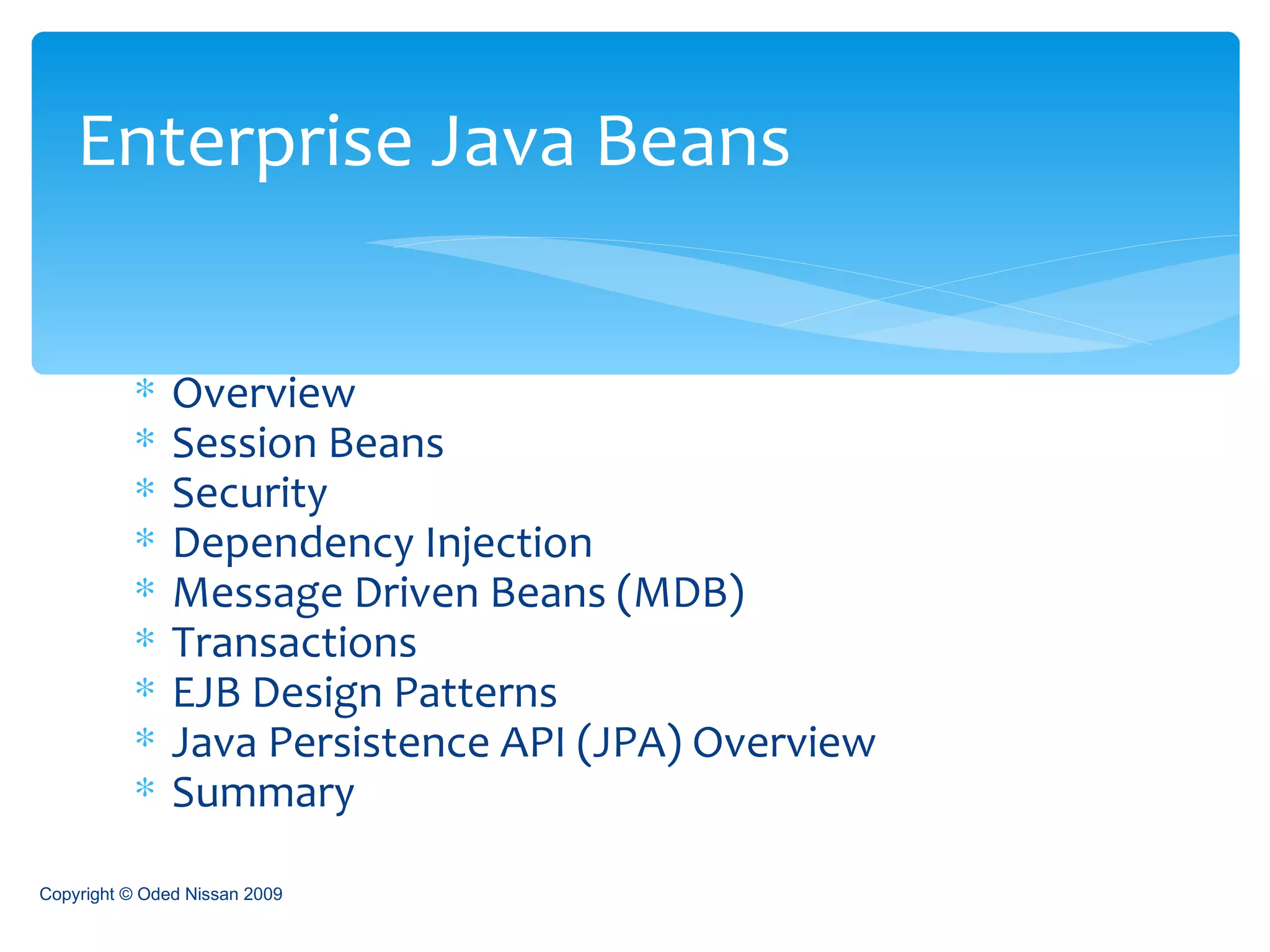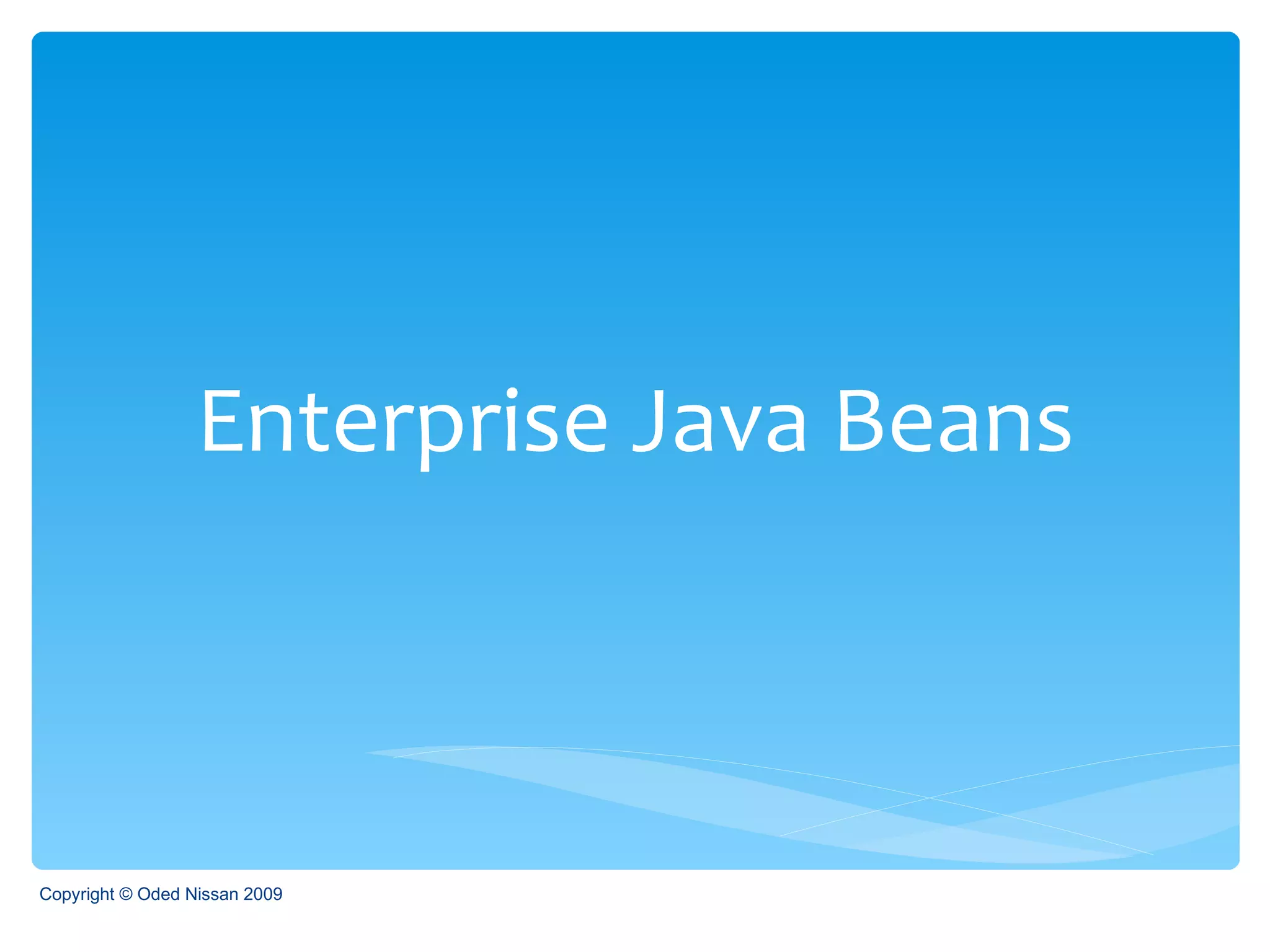This document provides an overview of Enterprise Java Beans (EJBs), including: