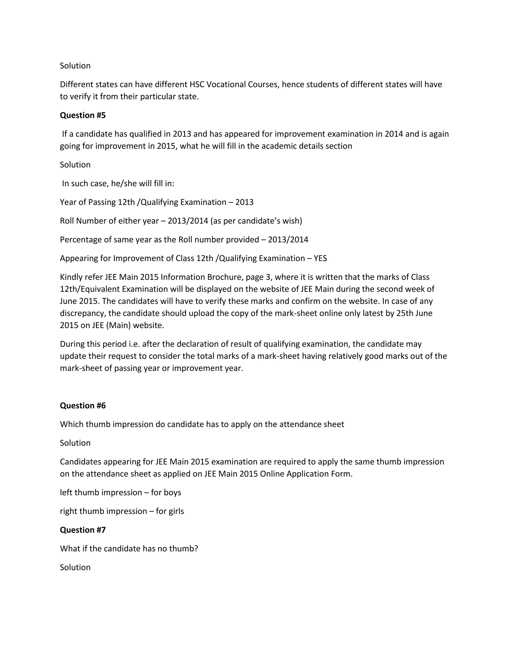 The document provides FAQs related to the JEE Main 2015 online application process, addressing common concerns of candidates. It includes information on examination scheduling, eligibility for diploma holders, required documentation, and technical details regarding payment and exam modes. Additionally, it outlines procedures for addressing discrepancies in academic records and other application-related queries.