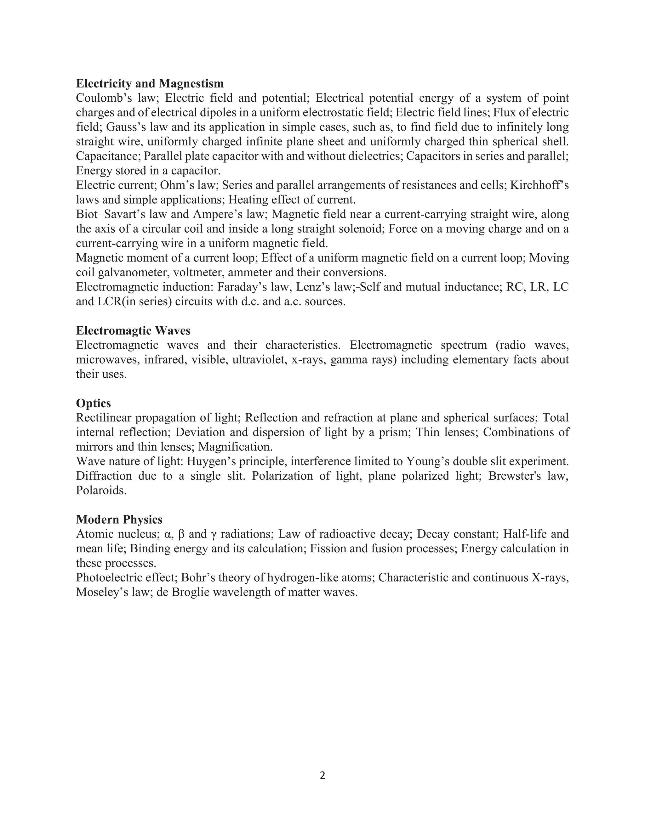 This document provides an overview of the physics, chemistry, and mathematics curriculum for JEE (Advanced). It covers topics including mechanics, thermodynamics, electromagnetism, modern physics, atomic structure, chemical bonding, thermodynamics, equilibrium, electrochemistry, kinetics, organic chemistry, and environmental chemistry. The document also lists specific experiments to be covered in the physics curriculum related to measurements, properties of materials, optics, and electricity.