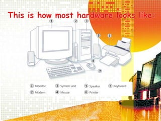 The document discusses the main hardware and software components of a computer. It describes that hardware refers to the physical parts like the monitor, keyboard, mouse, and system unit. The system unit contains the central processing unit and memory. Software refers to the programs and instructions that control what the hardware can do.