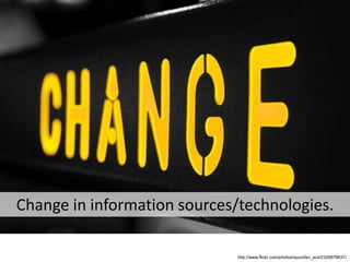 The document discusses the changing role of librarians due to new information technologies. It lists some modern information sources like blogs, wikis, and social networking sites that librarians can now use. Librarians can take on roles like being a technology specialist, promoting information use, managing institutional repositories, and acting as a community manager by making profiles and groups on social networking sites. New technologies allow librarians to collaborate with users and peers in real time and spread ideas virally.