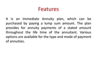 The Jeevan Akshay Vi Plan No. 189 is an immediate annuity plan that offers various annuity payment options for the lifetime of the annuitant after a lump sum payment. Multiple payment modes are available, and options differ based on conditions like death, ensuring certain payments to spouses. Key features include no medical examination, a minimum purchase price, and incentives for higher purchase amounts, along with a 15-day cooling-off period for policy cancellation.