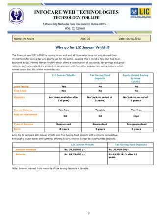 This document presents a summary of a single premium non-linked insurance plan for Mr. Anant aged 30. It outlines key details of the plan including a sum assured of Rs. 150,000, term of 10 years, and single premium of Rs. 30,000. On maturity, the guaranteed maturity sum of Rs. 69,294 along with any loyalty additions will be payable. The plan provides life cover of 5 times the single premium and allows for loan and surrender benefits after 2 years.