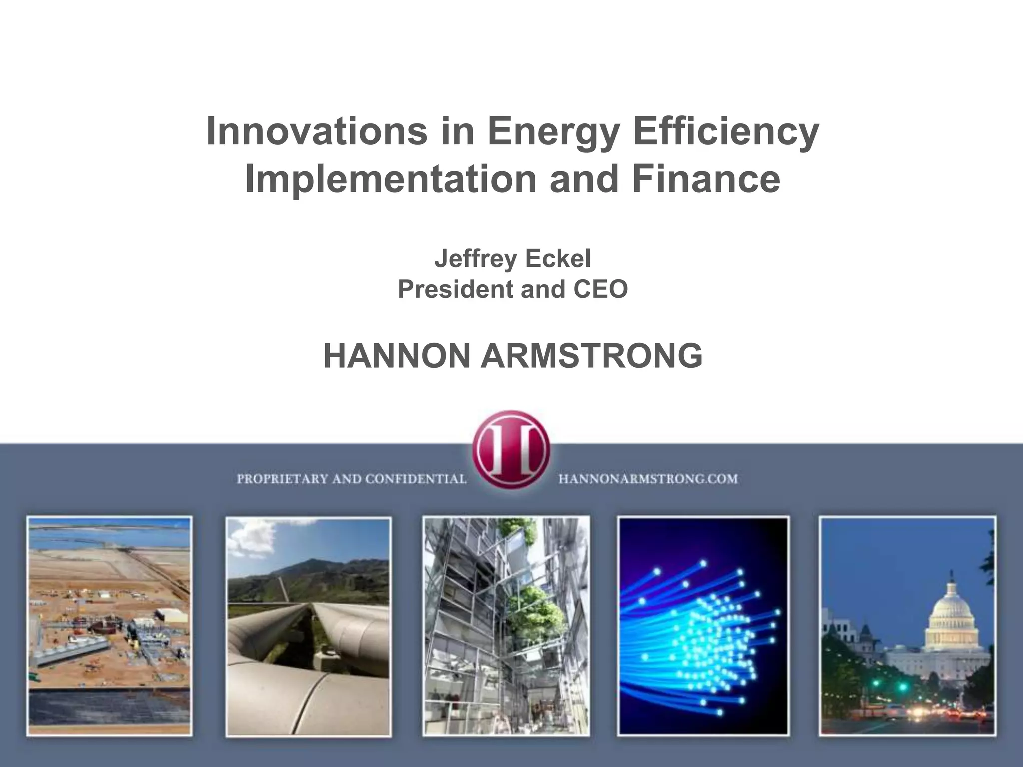 Hannon Armstrong Capital, an investment and merchant bank, focuses on financing energy efficiency and infrastructure projects in the U.S. The document discusses various financing innovations, including tax-exempt leases and the potential expansion of federal energy savings performance contracts (ESPC) to increase market scalability. Hannon is exploring unsecured portfolio financing for commercial buildings, although challenges remain in achieving significant scale.