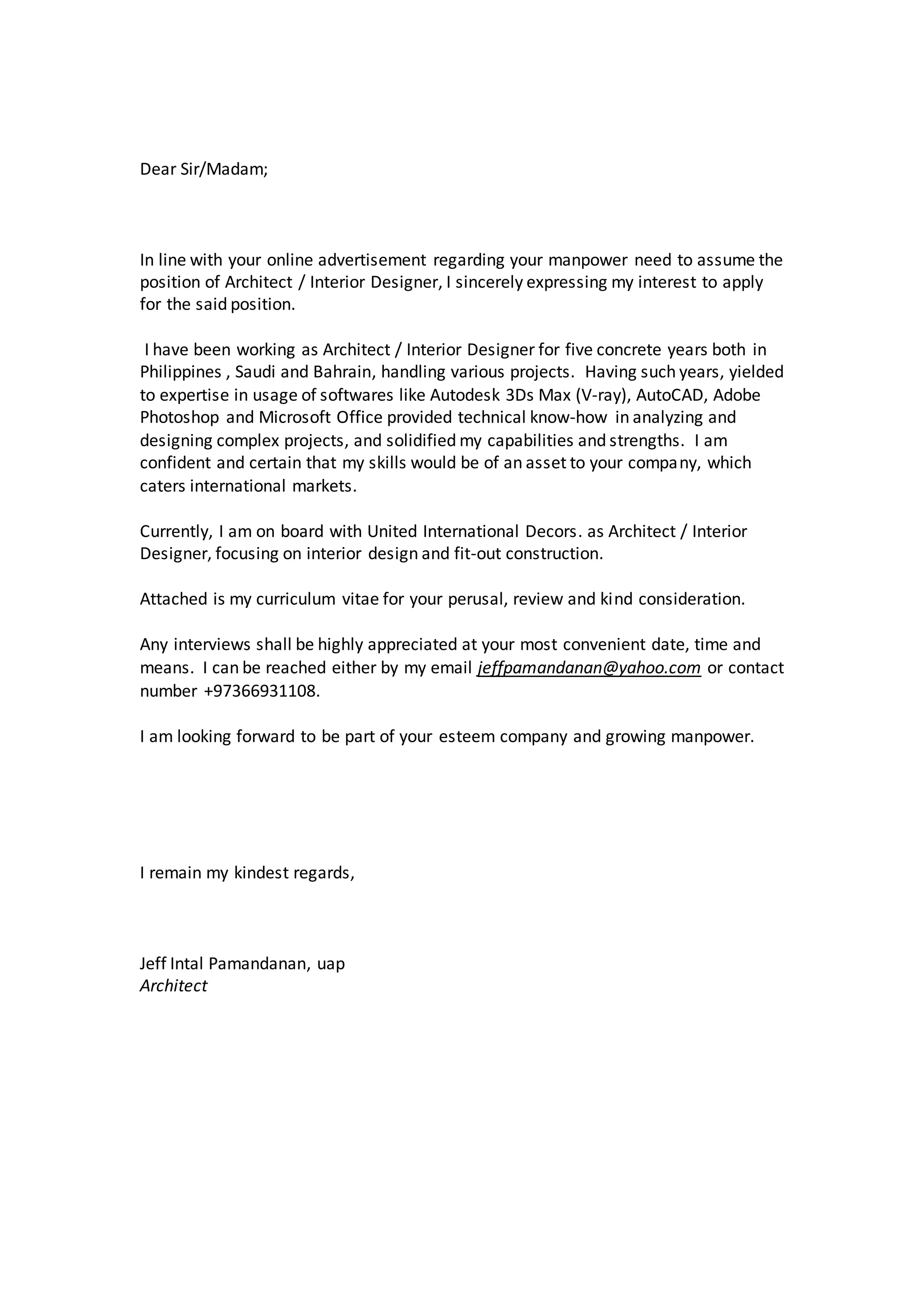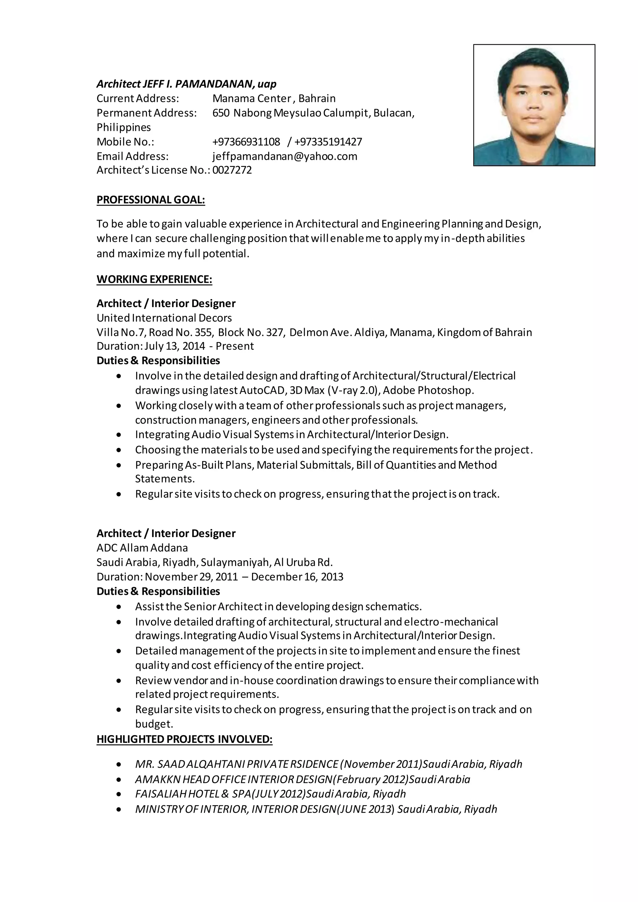 Jeff Intal Pamandanan is applying for an Architect/Interior Designer position. He has 5 years of experience in the Philippines, Saudi Arabia, and Bahrain working on various projects. He is currently employed as an Architect/Interior Designer but is interested in this new opportunity due to the company catering to international markets.