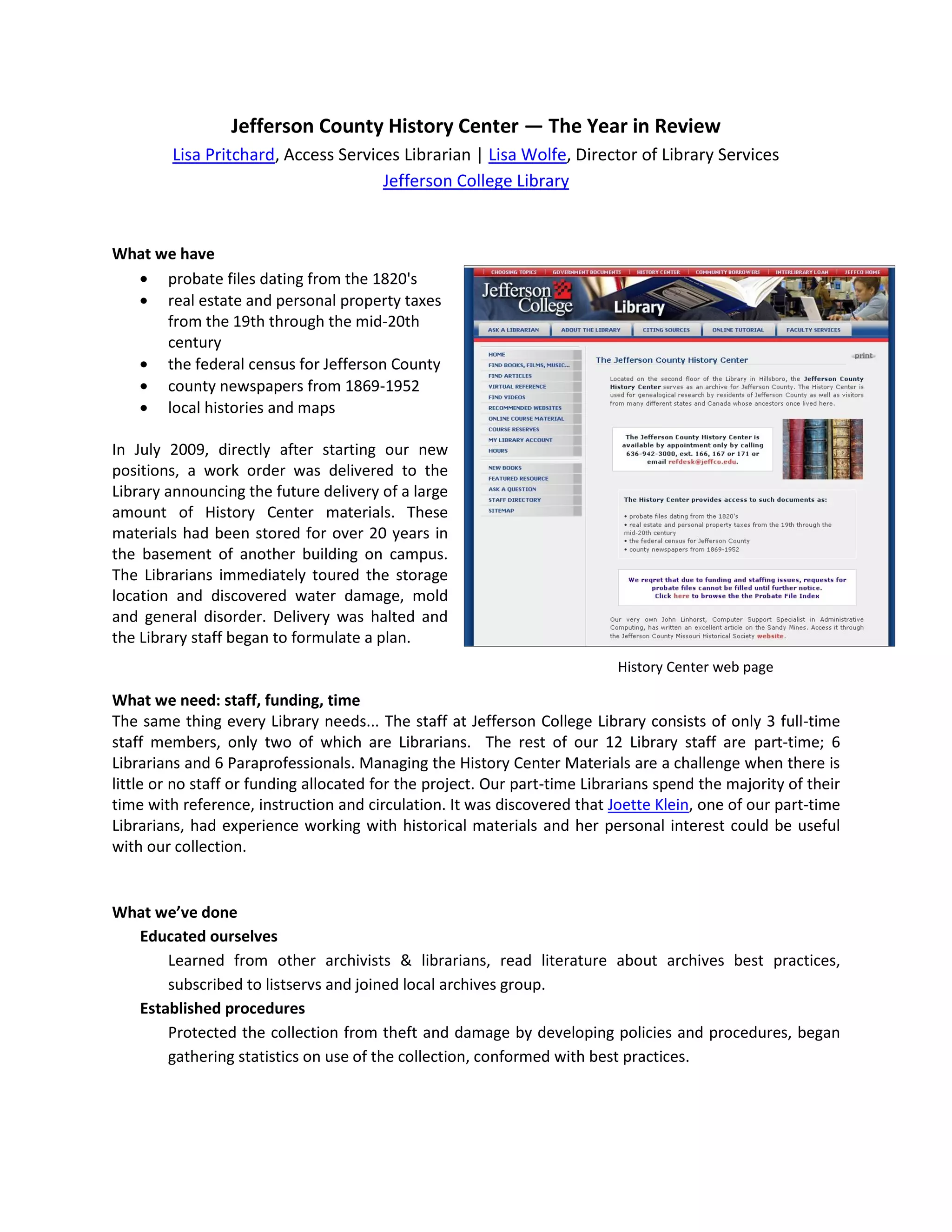 The document discusses the Jefferson County History Center located at the Jefferson College Library. It details some of the historical materials in the collection, including probate files, census records, newspapers and maps. It describes the discovery of additional materials in poor condition stored off-site and the library's efforts to establish policies and procedures to preserve, catalog and provide access to the collection with limited staff and funding resources. It highlights some successes in partnering with other institutions and individuals to increase digitization, cataloging and research services for the materials.