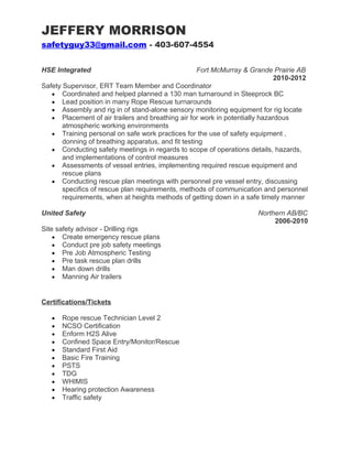 Jeffery Morrison has over 10 years of experience in safety roles, including as an ERT team member, safety supervisor, and site safety advisor for drilling rigs. He has extensive experience in confined space entry, atmospheric testing, rope rescue skills training, emergency response, and safety inspections. Morrison holds certifications in rope rescue, confined space, first aid, fire safety, WHMIS, and transportation of dangerous goods.