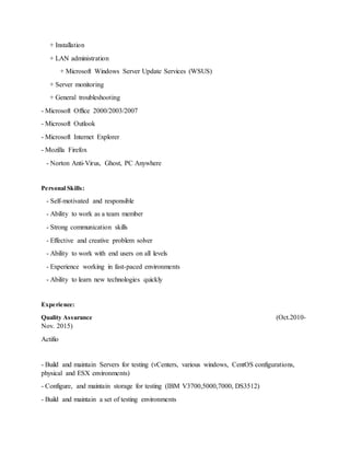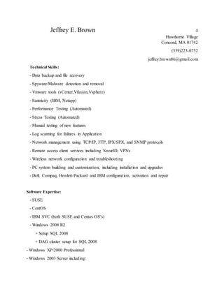 Jeffrey Brown has over 15 years of experience in IT with expertise in systems administration, networking, storage administration, software testing and end user support. He has worked in both military and civilian roles supporting over 1,000 end users and various operating systems including Windows, Linux and IBM SVC storage systems. His technical skills include data backup, malware removal, virtualization, performance testing, and network troubleshooting using various protocols. He holds an Associate's degree in Computer Science.
