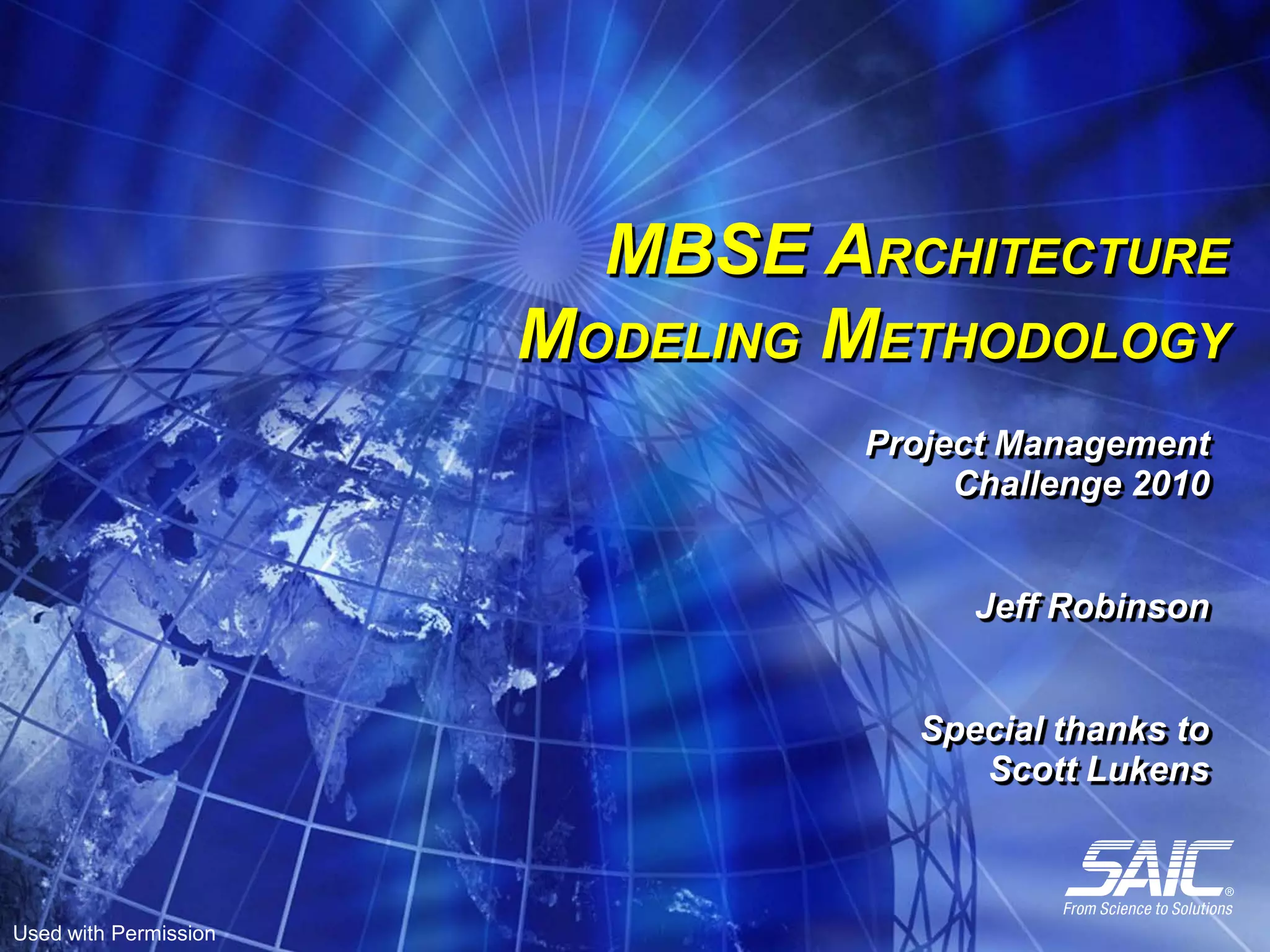 The document discusses an architecture modeling methodology for model-based systems engineering projects. It involves developing hierarchical architecture models, using the models to derive requirements, and tracing requirements to model elements. The methodology includes context diagrams to illustrate physical elements outside the system, decomposing physical and operational/functional elements, and using operational scenarios to develop mission operations and system functions. The modeling approach aims to generate a complete picture of the architecture and stakeholder problem.