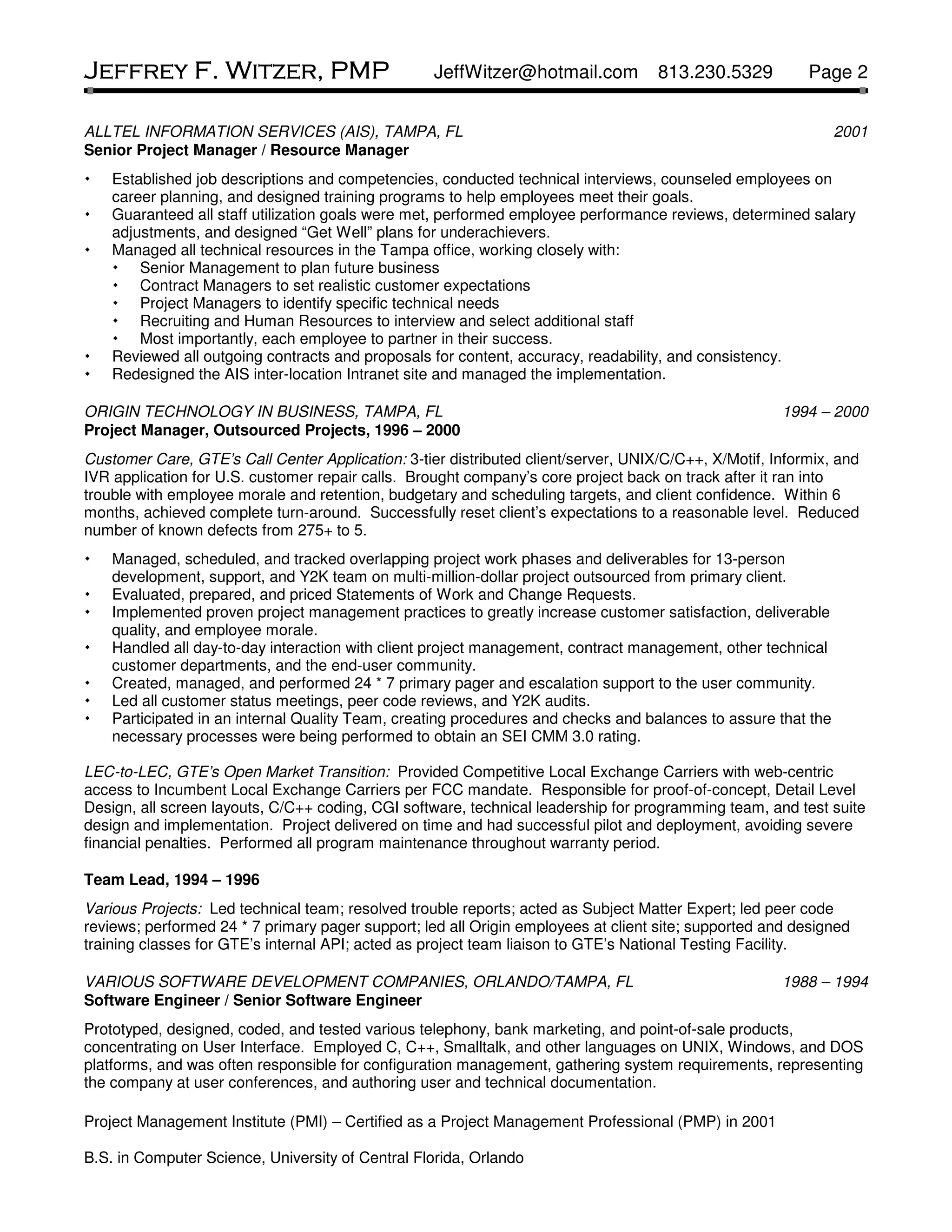 Jeffrey F. Witzer is a seasoned project manager and software engineer with 21 years of experience in software development and team leadership, specializing in IT initiatives and strategic planning. His notable roles include senior project management positions at Wachovia and Alltel, where he successfully turned around failing projects and improved processes. He holds a PMP certification and a B.S. in computer science, showcasing his technical expertise and commitment to enhancing project management maturity.