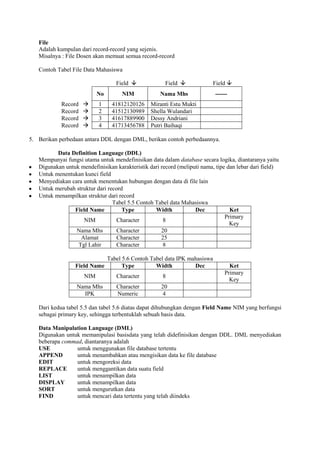 Dokumen ini menjelaskan konsep dasar dalam pengolahan data, termasuk perbedaan antara data, pengolahan, dan informasi, serta berbagai jenis file dan bahasa yang digunakan dalam basis data. Selain itu, dikupas juga tentang peran sistem basis data dan DBMS dalam pengelolaan informasi, serta hirarki data yang mencakup bit, karakter, field, record, file, dan basis data. Terdapat juga penjelasan mengenai siapa saja yang menggunakan basis data dalam berbagai organisasi.