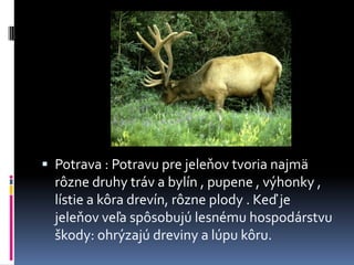 Potrava : Potravupre jeleňov tvoria najmä rôzne druhy tráv a bylín , pupene , výhonky , lístie a kôra drevín, rôzne plody . Keď je jeleňov veľa spôsobujú lesnému hospodárstvu škody: ohrýzajú dreviny a lúpu kôru.