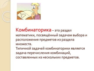 Документ содержит урок по комбинаторике для 9 класса, в котором рассматриваются задачи выбора и расположения предметов. Приведены примеры комбинаторных задач и способы их решения с использованием правил умножения и перечислений. Упомянуты практические задачи из обыденной жизни и учебные задания для закрепления материала.