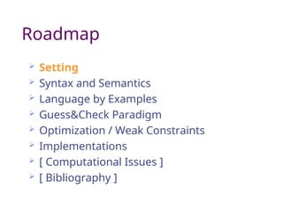 Programmazione ampiamente dichiarativa: non devo scrivere un complicato algoritmo, bensì basta che caratterizzi le proprietà delle soluzioni, e tanto basta perché il sistema le calcoli.