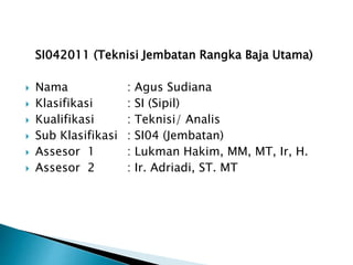 Dokumen tersebut merupakan spesifikasi teknis untuk pekerjaan sebagai teknisi jembatan rangka baja. Dokumen tersebut menjelaskan klasifikasi jembatan permanen, standar dan pedoman yang digunakan, spesifikasi material dan konstruksi jembatan baja serta kelebihan penggunaan struktur baja untuk jembatan.
