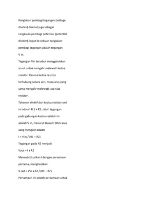 Dokumen ini menjelaskan tentang rangkaian pembagi tegangan dan Jembatan Wheatstone sebagai alat untuk mengukur hambatan listrik. Selain itu, dijelaskan juga hukum Ohm dan hukum Kirchhoff yang menjadi dasar bagi analisis rangkaian listrik. Dengan pemahaman ini, nilai tegangan output dapat diperoleh dalam kisaran yang diinginkan.