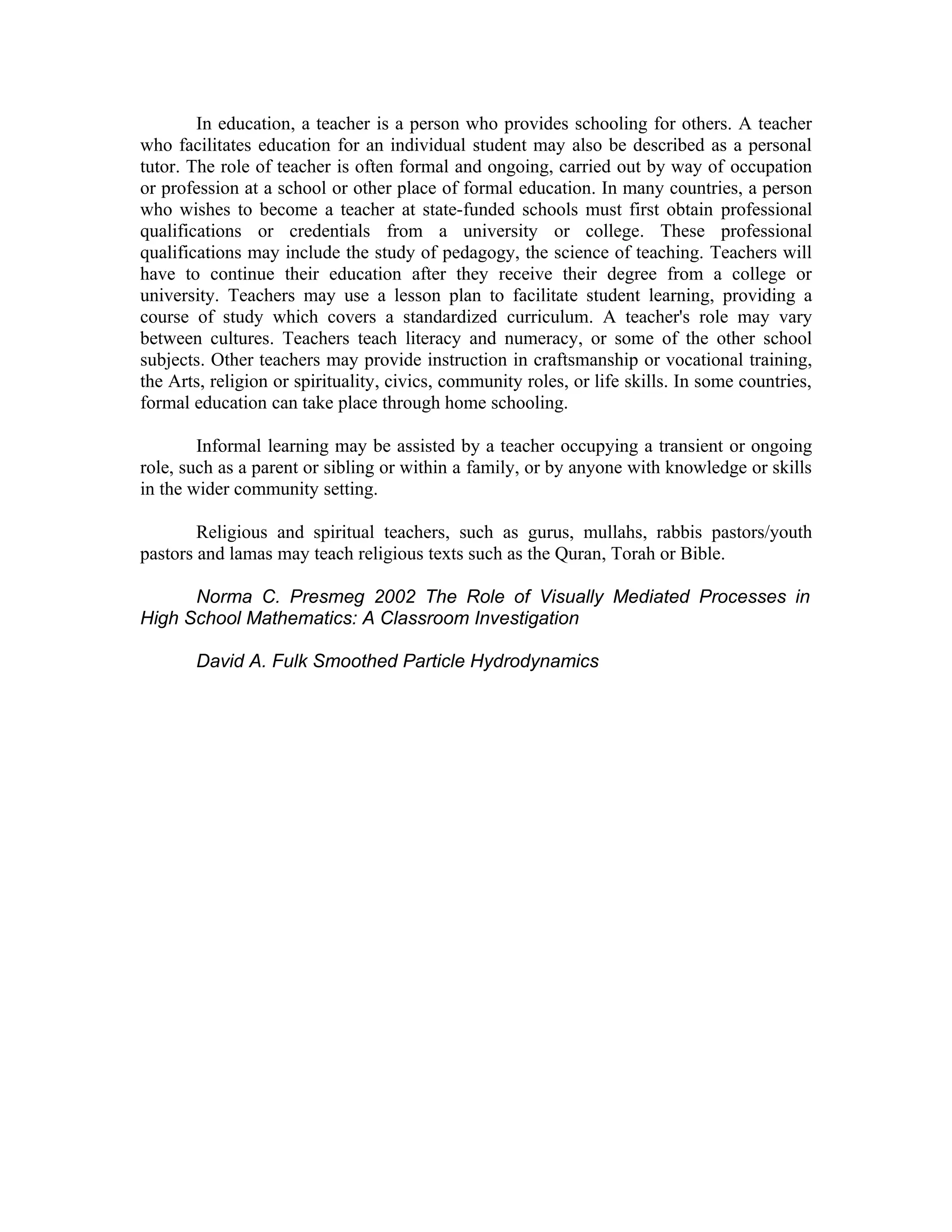 Teachers provide formal education to students in schools and other educational institutions. They facilitate learning through lesson plans that cover standardized curricriculums. A teacher's role may involve teaching subjects like literacy, numeracy, sciences, arts, or vocational skills. Obtaining professional qualifications from a college or university is often required to become a state-funded school teacher. Informal learning can also be assisted by family members or others in the community. Religious teachers facilitate the study of religious texts in spiritual education.