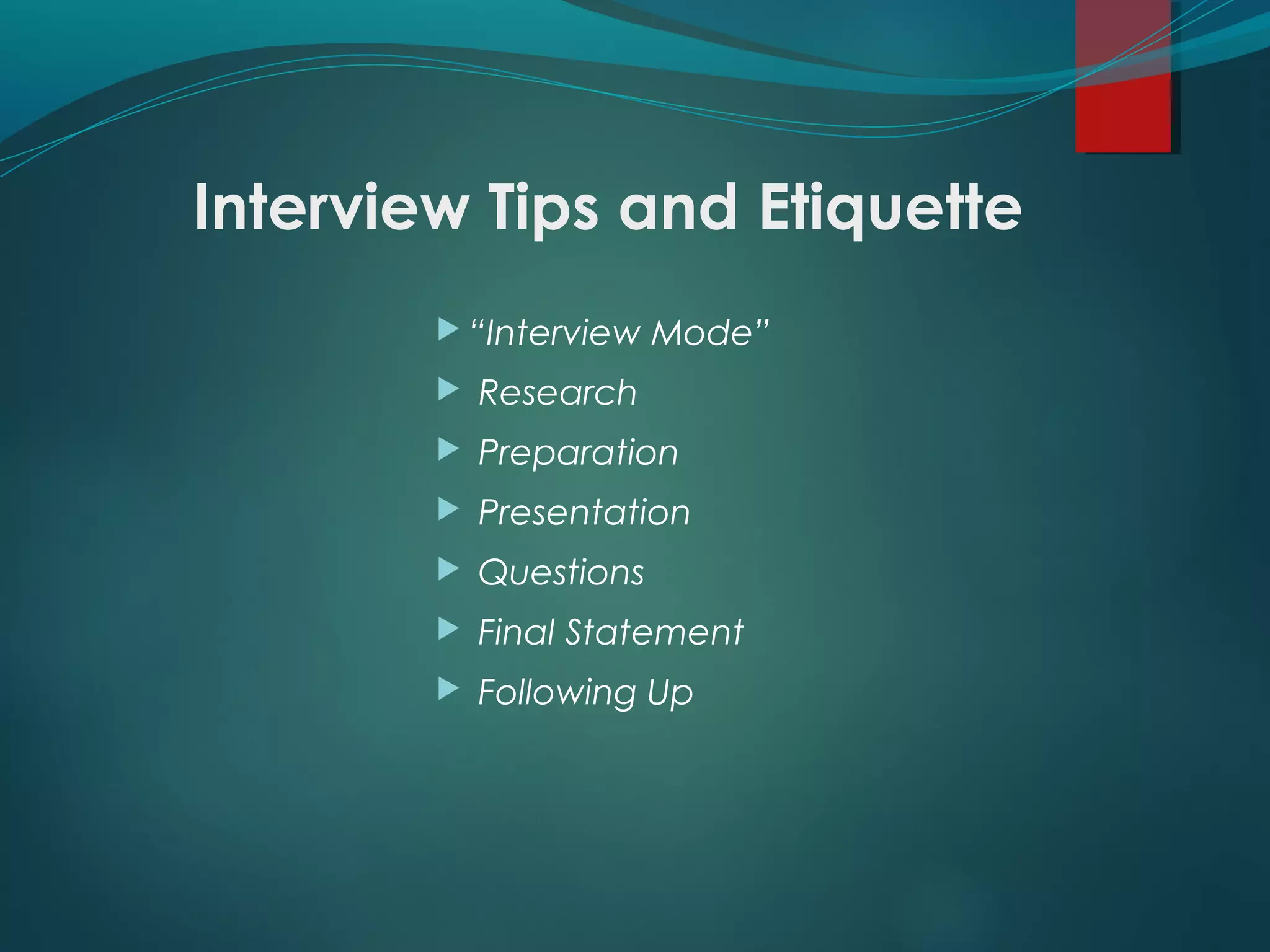 The document provides extensive tips and guidelines for interview preparation and performance. It discusses being in "interview mode" at all times and researching the company, position and interviewers thoroughly. Preparation involves choosing appropriate attire, practicing answers to common questions, and planning logistics. During the interview, the tips emphasize presenting professionally with good body language, answering the key questions of whether you can do the job and will fit in, and asking insightful questions. Follow-up recommendations include sending thank you notes promptly and keeping in touch regarding next steps.