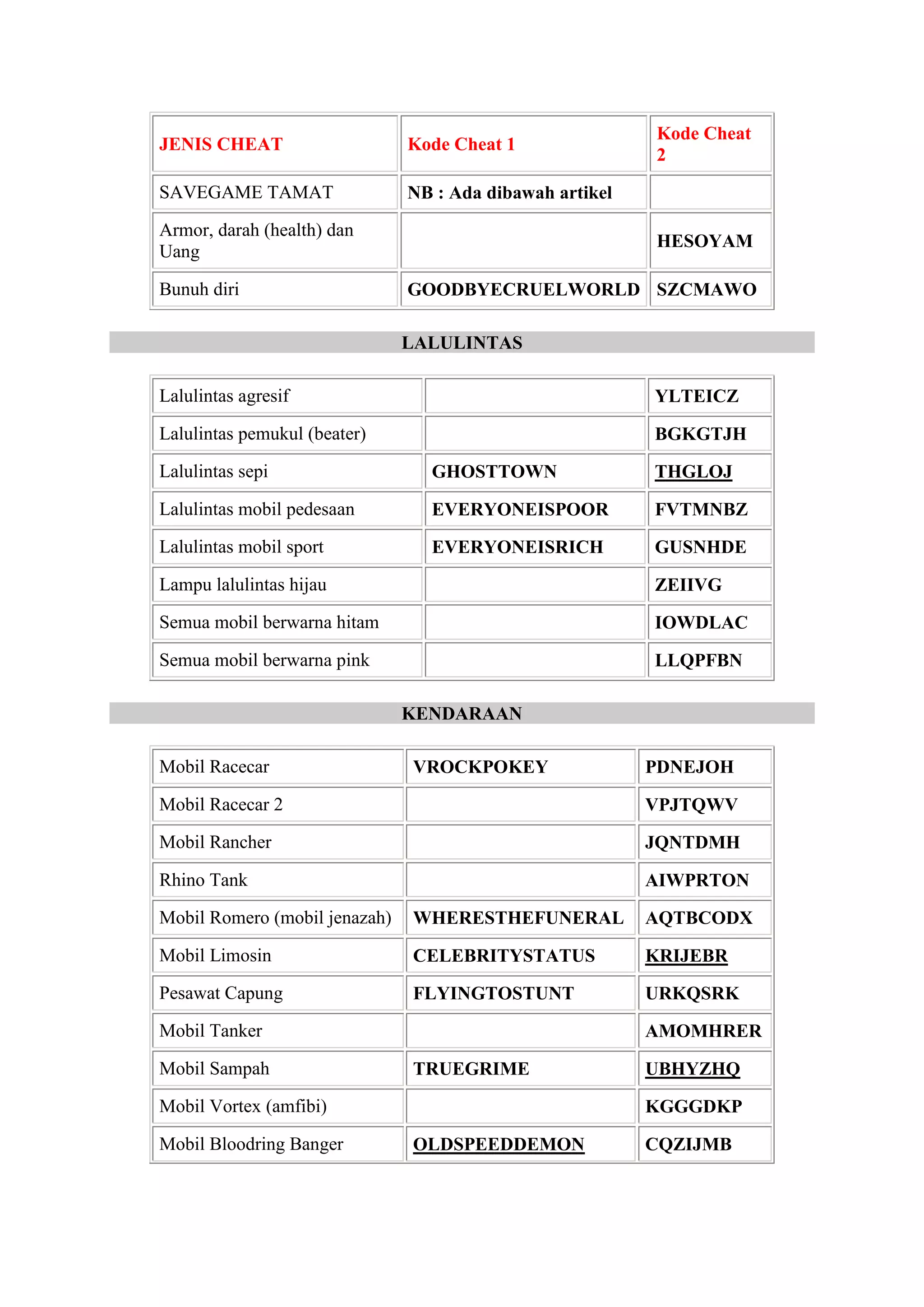 Dokumen ini merupakan kumpulan cheat codes untuk permainan GTA San Andreas, mencakup berbagai aspek seperti kendaraan, senjata, cuaca, dan kemampuan karakter. Selain itu, terdapat informasi tentang savegame yang sudah 100% tamat, memungkinkan pemain untuk menikmati permainan tanpa misi yang sulit. Savegame tersebut dilengkapi dengan uang, karakter yang sudah dimodifikasi, dan status maksimum di berbagai aspek.