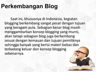 Blog berkembang pesat di Indonesia dengan tujuan beragam. Ada blog yang masih menggunakan konsep blogging semula dan ada pula yang menyimpang dari konsep asli. Terdapat berbagai jenis blog berdasarkan platform, format isi, dan tema seperti blog gratis, self-hosting, mikroblog, niche blog, dan blog pribadi.