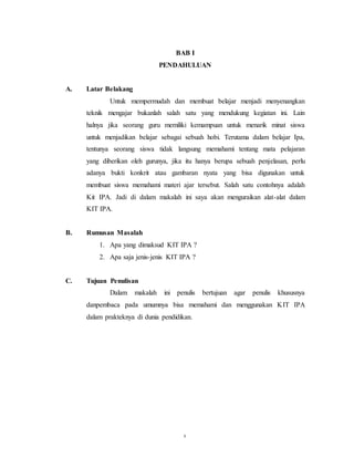 Dokumen ini menjelaskan pentingnya penggunaan alat peraga IPA dalam pendidikan untuk memfasilitasi pemahaman siswa terhadap materi pelajaran. Terdapat berbagai jenis alat peraga IPA yang bisa digunakan, termasuk kit neraca, kit bunyi, dan kit optika, serta fungsinya dalam proses pembelajaran. Penulis bertujuan untuk memberikan pemahaman tentang alat-alat tersebut sekaligus meningkatkan keterlibatan siswa dalam belajar.
