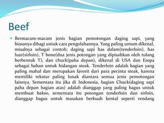 Dokumen ini menjelaskan berbagai jenis pemotongan daging sapi dan penggunaannya dalam masakan. Bagian-bagian seperti Tenderloin, Sirloin, dan Chuck memiliki karakteristik dan kegunaan spesifik, mulai dari steak hingga bakso. Setiap potongan memiliki keunggulan tersendiri berdasarkan tekstur dan cara pengolahan yang sesuai.