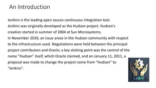 Jenkins is an open-source tool for continuous integration that was originally developed as the Hudson project. It allows developers to commit code frequently to a shared repository, where Jenkins will automatically build and test the code. Jenkins is now the leading replacement for Hudson since Oracle stopped maintaining Hudson. It helps teams catch issues early and deliver software more rapidly through continuous integration and deployment.