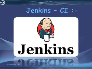 Jenkins is an open source tool that automates the continuous integration process. It monitors source code repositories for changes, automatically builds the code, runs tests, and provides feedback to developers. Before CI tools like Jenkins, software delivery was slow and locating bugs after integration was difficult. With Jenkins, every code change triggers an automatic build and test, improving feedback and release frequency while reducing bug fixing time. Jenkins has over 1000 plugins and alternatives include Travis CI, Buildbot, Bamboo, and JetBrains TeamCity.