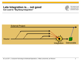 Jenkins is a tool that supports continuous integration by automatically building, testing, and deploying code changes. It integrates code changes frequently, at least daily, to avoid "big bang" integrations. Jenkins runs builds and tests across multiple platforms using slave nodes. It supports various source control systems and build tools and notifies developers of failed builds or tests through email or other plugins.