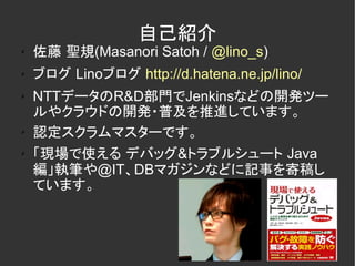 佐藤 聖規(Masanori Satoh / @lino_s) ✗ ブログ Linoブログ http://d.hatena.ne.jp/lino/ ✗ NTTデータのR&D部門でJenkinsなどの開発ツー ルやクラウドの開発・普及を推進しています。 ✗ 認定スクラムマスターです。 ✗ 「現場で使える デバッグ&トラブルシュート Java 編」執筆や@IT、DBマガジンなどに記事を寄稿し ています。