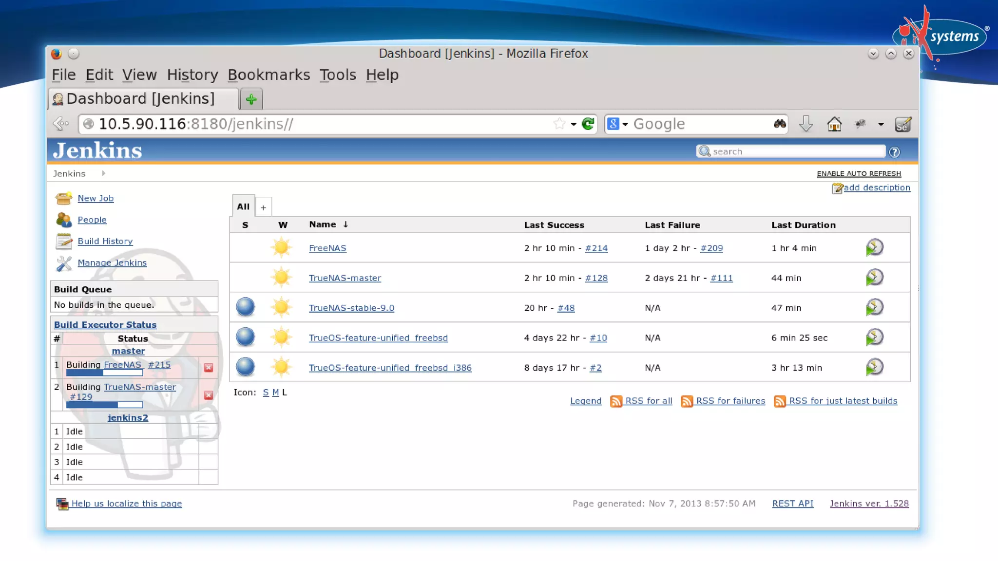 The document discusses the installation and configuration of Jenkins, an open-source continuous integration tool, on FreeNAS, along with its integration with bhyve and WebDriver for testing. It details how to install Jenkins, its web configuration, and available community support. Additionally, it highlights the use of Python's Splinter library with WebDriver for automated web application testing.