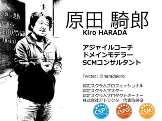 HARADA アジャイルコーチ ドメインモデラー SCMコンサルタント Twitter: @haradakiro 認定スクラムプロフェッショナル 認定スクラムマスター 認定スクラムプロダクトオーナー 株式会社アトラクタ 代表取締役
