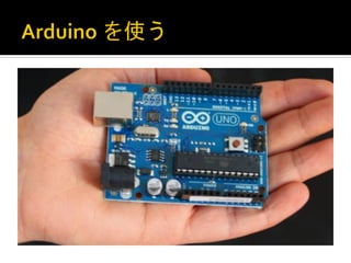 § AVR マイコンボード § Arduino 言語と統合開発環境 ▪ アセンブラで書かなくても大丈夫 § 豊富な入出力と拡張性 ▪ Ethernet Shield で TCP/IP を喋れる § http://www.arduino.cc/
