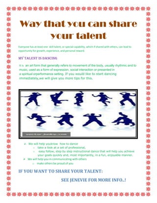 Everyone has a skill or talent that can benefit others if shared. The document discusses dancing as an art form of body movement that can be used for expression, social interaction, or performance. It offers to provide tips and instructional dance lessons to help others start dancing and achieve their goals in a fun way, while also helping them communicate better and gain recognition.