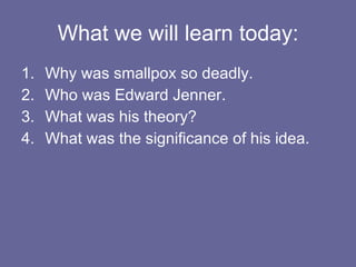 The document discusses the deadly smallpox disease in the 18th century and Edward Jenner's pioneering work developing the smallpox vaccine. It describes how Jenner observed that milkmaids who had previously contracted cowpox did not get smallpox, leading him to test the theory that cowpox protected against smallpox. In 1796, Jenner conducted an experiment where he took cowpox matter from a milkmaid and inoculated an 8-year-old boy, who was later exposed to smallpox but did not become ill, demonstrating the effectiveness of vaccination. Though initially met with some skepticism, vaccination was widely adopted and led to the eradication of smallpox by 1980.