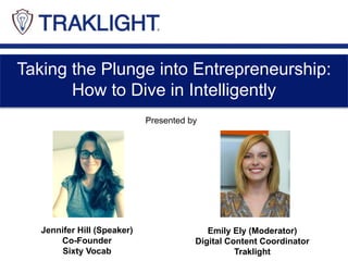 The document outlines a webinar titled 'Taking the Plunge into Entrepreneurship,' led by Jennifer Hill of Sixty Vocab, focusing on the key preparations and strategies for starting a business. It covers essential topics such as personal motivation, business financial considerations, team building, and legal advice. Attendees are encouraged to connect and utilize additional resources, including a blog for intellectual property insights.