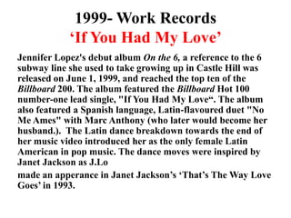 Jennifer Lopez is an American singer, actress, dancer and businesswoman. She rose to fame in the 1990s as a Fly Girl dancer on In Living Color before starting her acting and music career. Some of her most popular songs include "If You Had My Love", "Love Don't Cost a Thing" and "Jenny from the Block". She has collaborated with many rappers on her albums and is known for her Latin dance styles in her music videos. Lopez has had a successful career in music, film and television spanning over three decades.