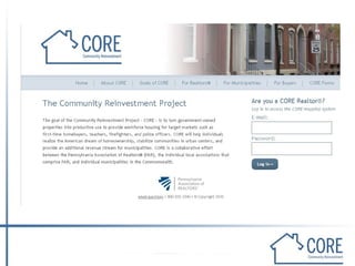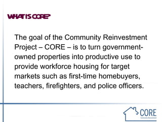 The Community Reinvestment Project (CORE) aims to convert government-owned properties into affordable housing for essential workers like first responders and teachers. CORE seeks to provide affordable housing, generate revenue for local governments, and streamline the process of selling properties to revitalize communities. The project framework was created by PAR, which brings in strategic partners while local associations handle public outreach. Current projects include a pilot with Philadelphia and partnerships in Reading to list additional properties through realtor support. Challenges include slow progress, but successes include strengthened partnerships.