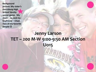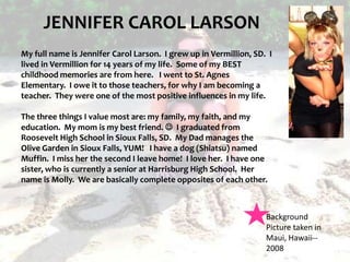This document provides biographical information about Jennifer Carol Larson. It discusses that she grew up in Vermillion, South Dakota and values her family, faith, and education. Her professional goals are to graduate from the University of South Dakota with a degree in elementary/special education and reading minor, get a teaching job in South Dakota, and work her way up to eventually becoming a school principal. In 10 years, she sees herself teaching in South Dakota, married with 2 children, a house, and involved in her church community. The document shares pictures of family, her boyfriend Chad, her dog Muffin, and activities over the years.