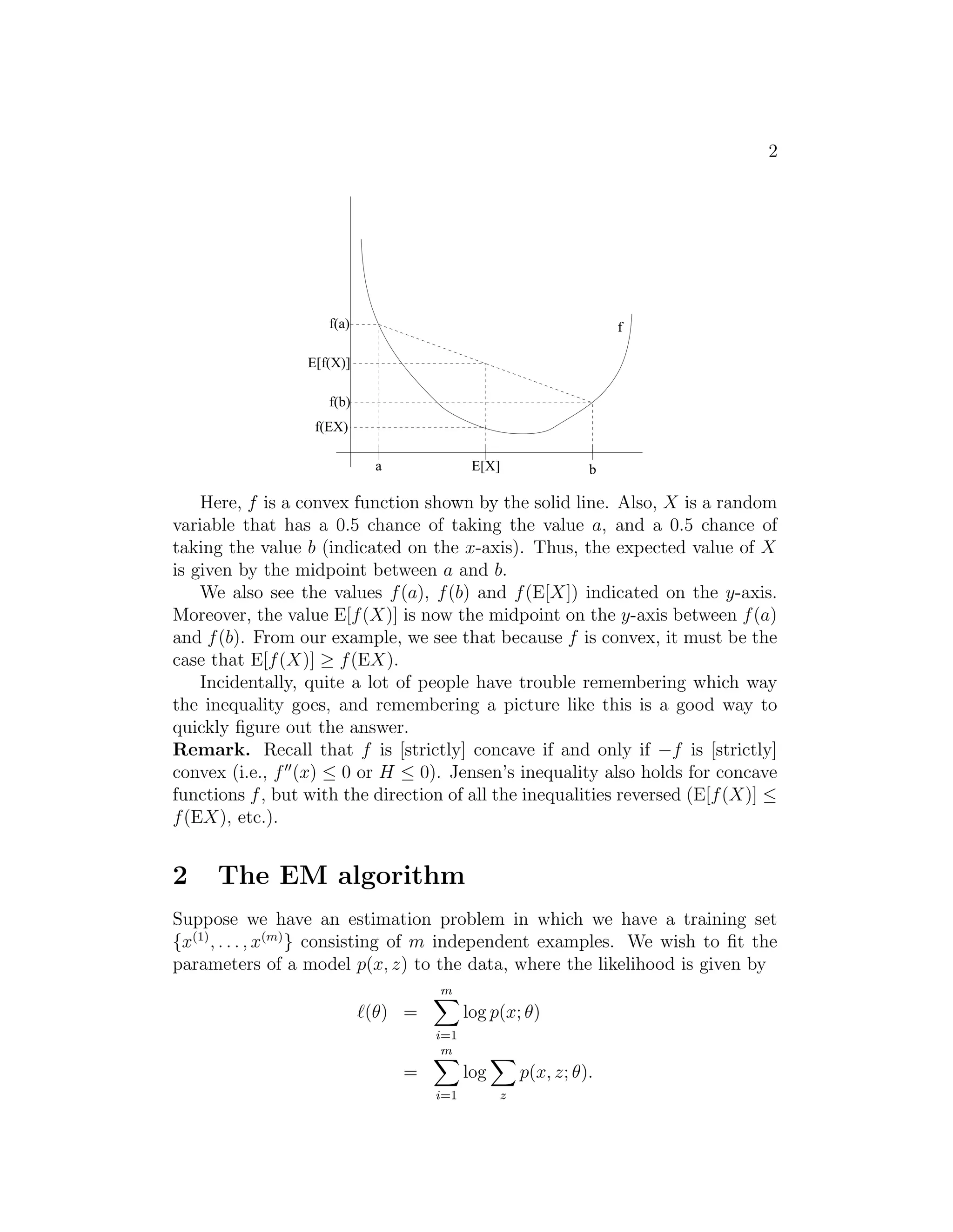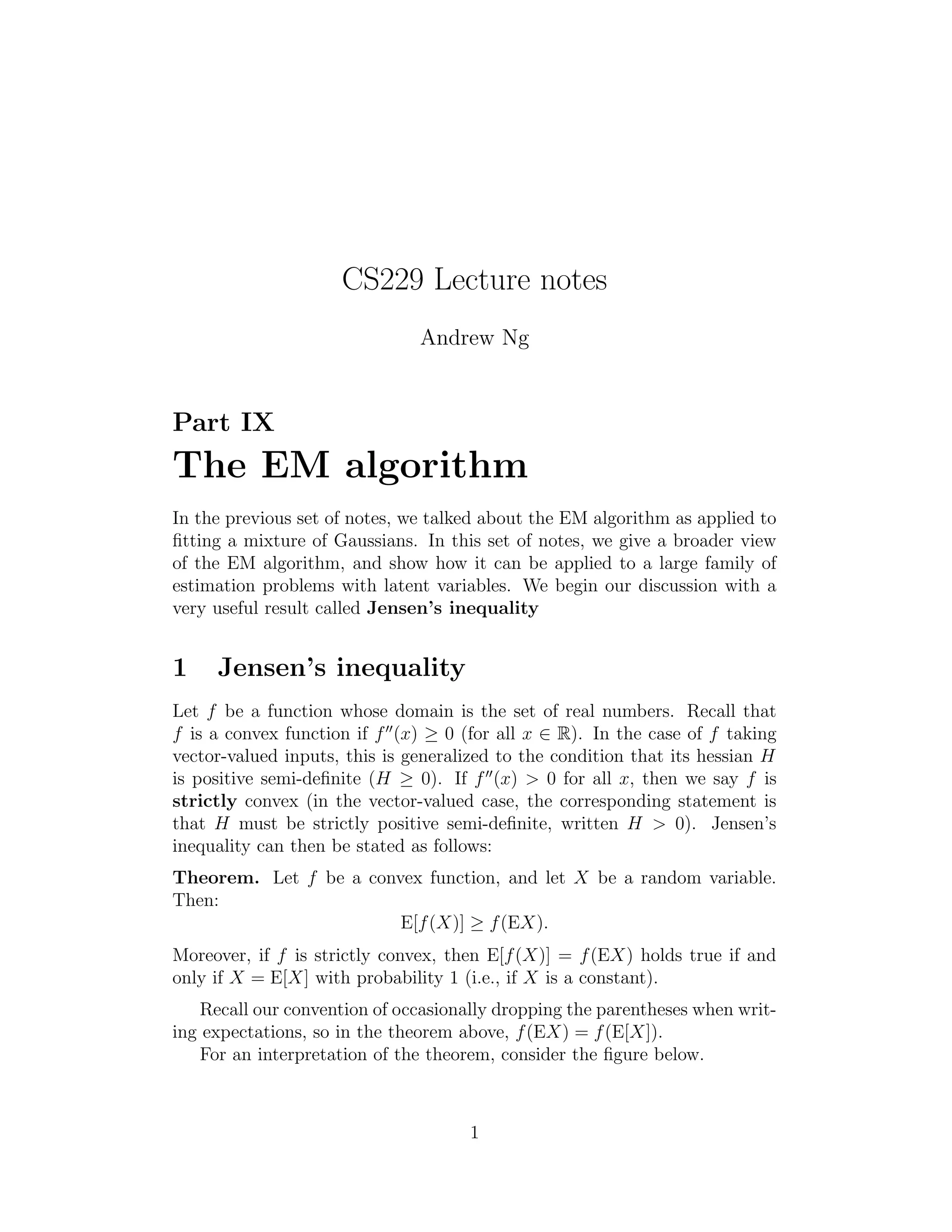The document provides an overview of the EM (Expectation-Maximization) algorithm and its application in estimation problems involving latent variables, building on Jensen's inequality as a foundation. It explains the iterative process of the algorithm by outlining the E-step and M-step for maximizing likelihood estimates, particularly in the context of fitting Gaussian mixture models. The conclusion emphasizes the algorithm's convergence properties and presents specific update rules for the parameters involved.