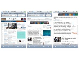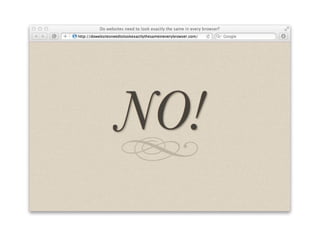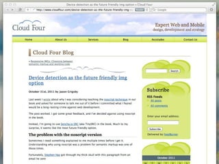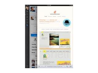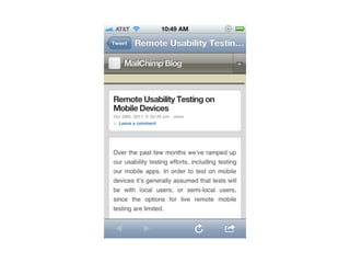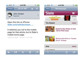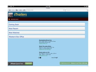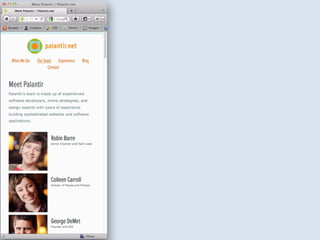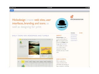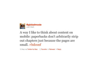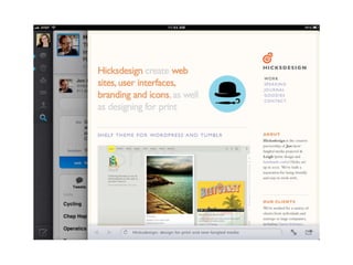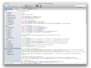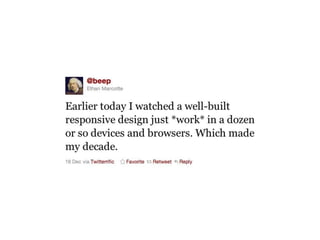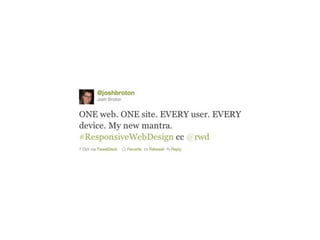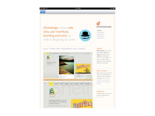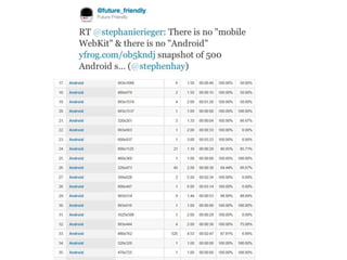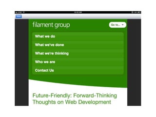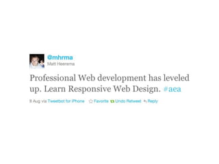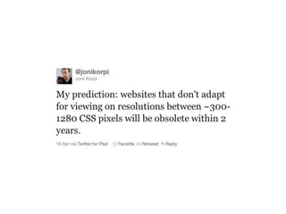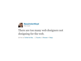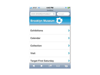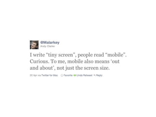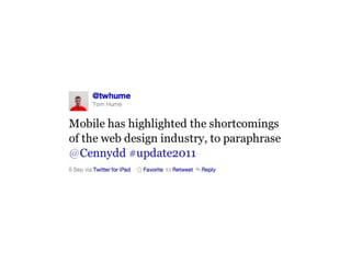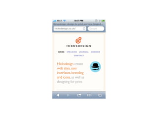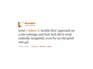 The document discusses the importance of mobile web design, presenting options for adapting websites for mobile devices, such as creating mobile themes, sites, or apps. It emphasizes the need for responsive web design and progressive enhancement to ensure compatibility across various devices. Additionally, it highlights the evolving design processes and tools for creating effective mobile websites.