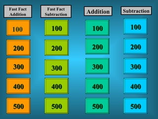 The document introduces a Jeopardy-style math game to review addition and subtraction skills up to three digits. The game is intended to help students practice academic knowledge standards involving adding and subtracting whole numbers, as well as using mental math strategies. Instructions are provided for playing the game whole group, small group, independently, or at home by accessing the PowerPoint from the class website.